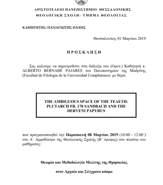 Εκ μέρους του Τμήματος Θεολογίας του Αριστοτέλειου Πανεπιστημίου Θεσσαλονίκης και του Καθηγητού ΠΑΝΑΓΙΩΤΗ ΠΑΧΗ, δημοσιεύεται πρόσκληση για την παρουσία των ενδιαφερομένων στη διάλεξη του (Ομοτ.) Καθηγητή κ. ALBERTO BERNABÉ PAJARES του Πανεπιστημίου της Μαδρίτης (Facultad de Filologia de la Universidad Complutense) με θέμα: “THE AMBIGUOUS SPACE OF THE ΤΕΛΕΤΗ: PLUTARCH FR. 178 SANDBACH AND THE DERVENI PAPYRUS” που πραγματοποιηθεί την Παρασκευή 08 Μαρτίου 2019 (10.00΄- 12.00΄)