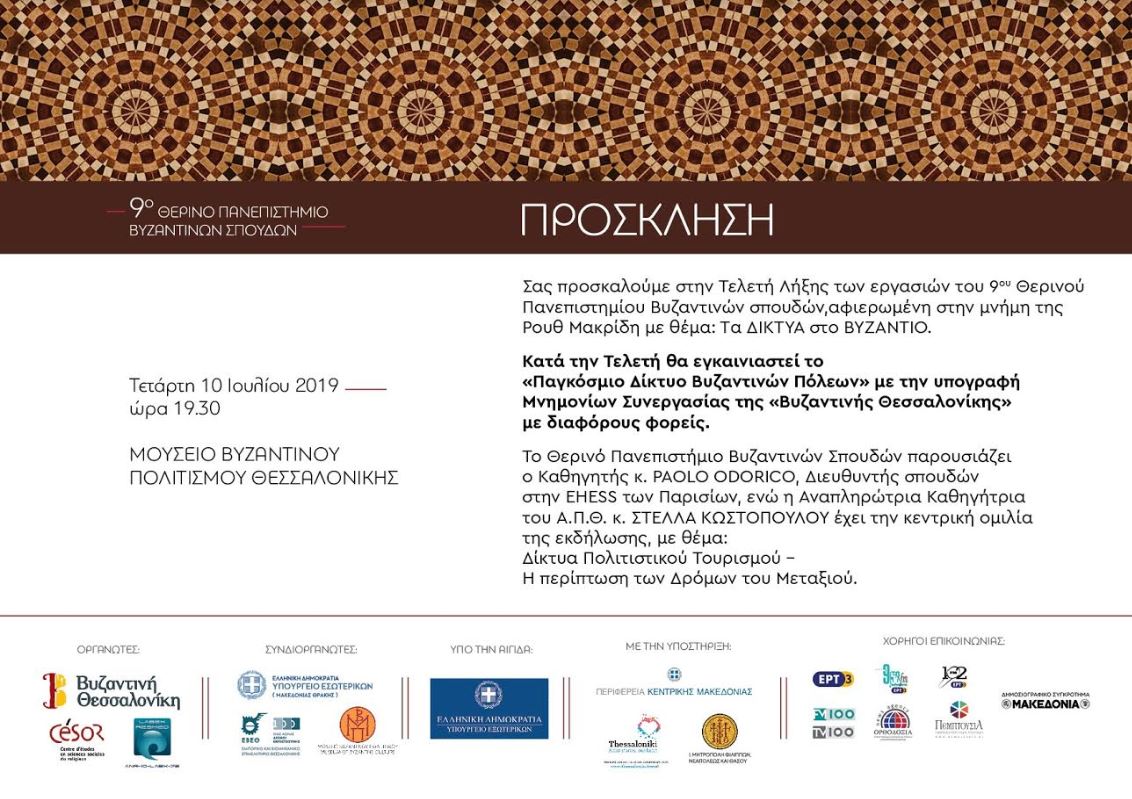 Πραγματοποιείται αύριο Τετάρτη 10 Ιουλίου στις 19.30 στο Μουσείο Βυζαντινού Πολιτισμού Θεσσαλονίκης, η τελετή λήξης των εργασιών του 9ου θερινού Πανεπιστημίου Βυζαντινών Σπουδών, αφιερωμένη στη μνήμη της Ρουθ Μακρίδη, με θέμα «Δίκτυα στο Βυζάντιο» .
