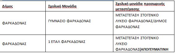 Α. Θα μεταστεγαστούν προσωρινά σε κτίρια σχολικών μονάδων στον ίδιο ή σε όμορους δήμους και σε πρωινή βάρδια (εκτός δύο περιπτώσεων όπου ρητώς αναφέρεται απογευματινή βάρδια) οι παρακάτω σχολικές μονάδες ή τάξεις σχολικών μονάδων: