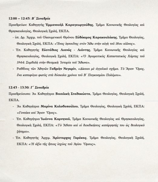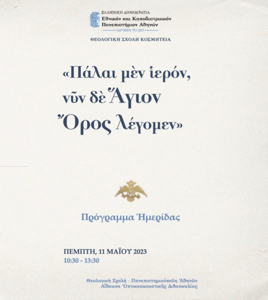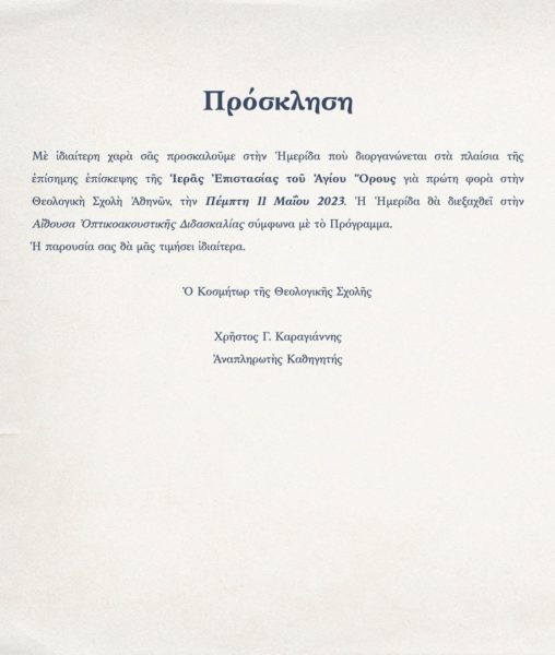 Στο πλαίσιο της επίσκεψης διοργανώνεται Ημερίδα με τίτλο: “Πάλαι μέν ιερόν νυν δε Άγιον Όρος λέγομεν”, την Πέμπτη 11 Μαίου 2023. Η Ημερίδα θα διεξαχθεί στην Αίθουσα Οπτικοακουστικής Διδασκαλίας, υβριδικά, διά ζώσης και εξ αποστάσεως.