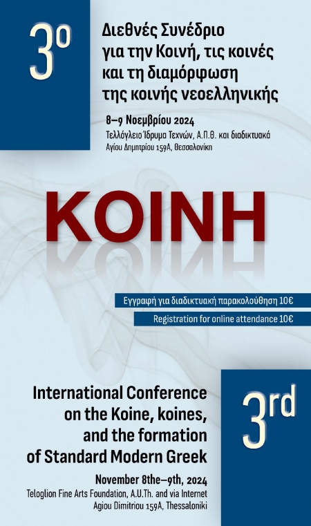 Το Ινστιτούτο Νεοελληνικών Σπουδών [Ίδρυμα Μ. Τριανταφυλλίδη] του Α.Π.Θ., στο πλαίσιο των ετήσιων διεθνών συνεδρίων για τη διαχρονική και διατοπική μελέτη της ελληνικής, διοργανώνει το «3ο Διεθνές Συνέδριο για την Κοινή, τις κοινές και τη διαμόρφωση της κοινής νεοελληνικής» στις 8 και 9 Νοεμβρίου 2024, στη Θεσσαλονίκη (Τελλόγλειο Ίδρυμα Τεχνών, Α.Π.Θ.). Το συνέδριο προβλέπεται να γίνει με υβριδικό τρόπο, δηλαδή με φυσική παρουσία και διαδικτυακά.