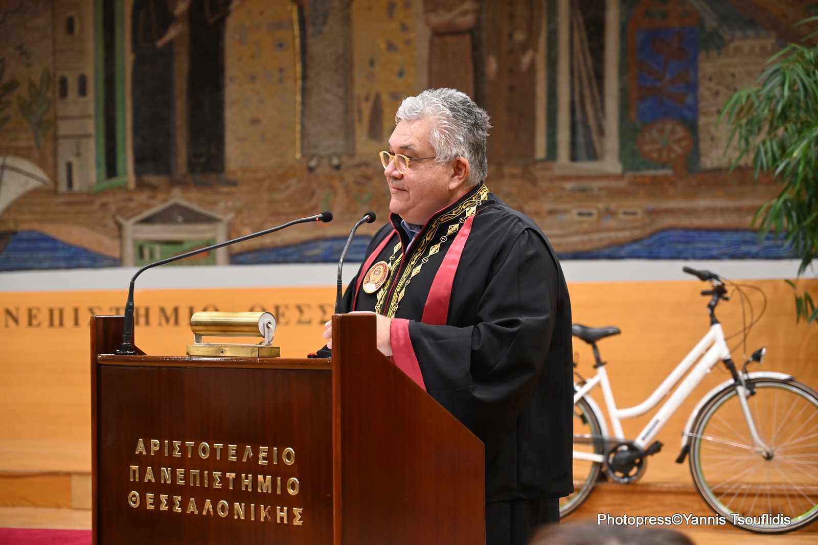 Τέλος, ο Πρύτανης του ΑΠΘ τόνισε «Άριστος δεν είναι ο βαθμοθήρας: είναι ο Καλλιεργημένος φοιτητής. Το Πανεπιστήμιό μας θα σας δώσει τις δυνατότητες να εντρυφήσετε σε θεματικές όπως είναι το περιβάλλον και οι στόχοι βιώσιμης ανάπτυξης, η προσβασιμότητα, οι σπουδές φύλου, η μουσική και τόσα πολλά άλλα. Ψάξτε τα, κυνηγήστε τα και σας υπόσχομαι ότι τα εφόδια αυτά θα σας ακολουθήσουν σε όλη σας τη ζωή. Σας εύχομαι κάθε καλό στην πορεία σας από εδώ και έπειτα. Η πόρτα οι δική μου και όλων των Αντιπρυτάνεων θα είναι πάντοτε ανοιχτή για εσάς».