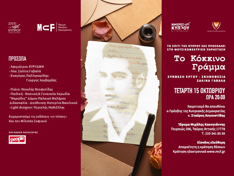 Το Σπίτι της Κύπρου, στο πλαίσιο των Ημερών Κύπρου 2025, διοργανώνει την Τετάρτη 15 Οκτωβρίου στις 8 μ.μ. στο Ίδρυμα Μιχάλης Κακογιάννης, τη μουσικοθεατρική παράσταση «Το Κόκκινο Γράμμα», σε σύνθεση και σκηνοθεσία Σαλίνας Γαβαλά. Χαιρετισμό θα απευθύνει ο Πρέσβης της Κυπριακής Δημοκρατίας στην Ελλάδα, κ. Σταύρος Αυγουστίδης.