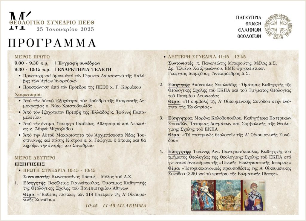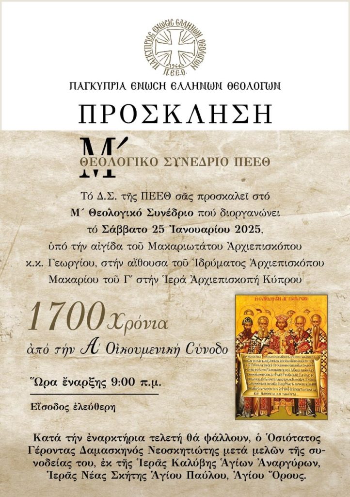 Το Δ.Σ. της Παγκύπριας Ένωσης Ελλήνων Θεολόγων (ΠΕΕΘ) προσκαλεί στο Μ΄ Θεολογικό Συνέδριο με θέμα «1.700 χρόνια από την Α΄ Οικουμενική Σύνοδο», που διοργανώνει το Σάββατο 25 Ιανουαρίου, στις 9πμ, υπό την αιγίδα του Μακαριωτάτου Αρχιεπισκόπου Κύπρου κ.κ. Γεωργίου, στην αίθουσα του Ιδρύματος Αρχιεπισκόπου Μακαρίου του Γ΄ στην Ιερά Αρχιεπισκοπή Κύπρου.