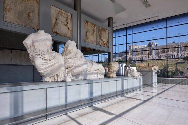 Οι εκθεσιακές ενότητες είναι κατά κύριο λόγο τοπογραφικές. Η πρώτη μεγάλη αίθουσα είναι μια γυάλινη ράμπα, με ευρήματα από τις κλιτύες (πλαγιές) της Ακρόπολης. Μετά την άνοδο, στον πρώτο όροφο, στο τμήμα με την υψηλή οροφή και τους φωταγωγούς, παρουσιάζονται τα εκθέματα της αρχαϊκής Ακρόπολης, ενώ στο υπόλοιπο τα γλυπτά του ναού της Αθηνάς Νίκης και του Ερεχθείου, καθώς και τα αρχιτεκτονικά μέλη των Προπυλαίων. Η κορύφωση της έκθεσης, ο τρίτος όροφος, είναι αφιερωμένος αποκλειστικά στα γλυπτά του Παρθενώνα. Η τελευταία εκθεσιακή ομάδα, στο βόρειο τμήμα του πρώτου ορόφου, περιλαμβάνει έργα από τον 5ο αι. π.Χ. μέχρι το τέλος της αρχαιότητας.
