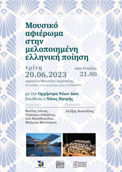 Με την ευκαιρία των γενεθλίων του Μουσείου Ακρόπολης την Τρίτη 20 Ιουνίου 2023, τιμώντας τη μνήμη του αείμνηστου Προέδρου του, το Μουσείο προσκαλεί την Ορχήστρα Νέων Δίου να προσφέρει στους επισκέπτες του δωρεάν ένα μουσικό αφιέρωμα στην μελοποιημένη ελληνική ποίηση, στον προαύλιο χώρο του στις 9 μ.μ.