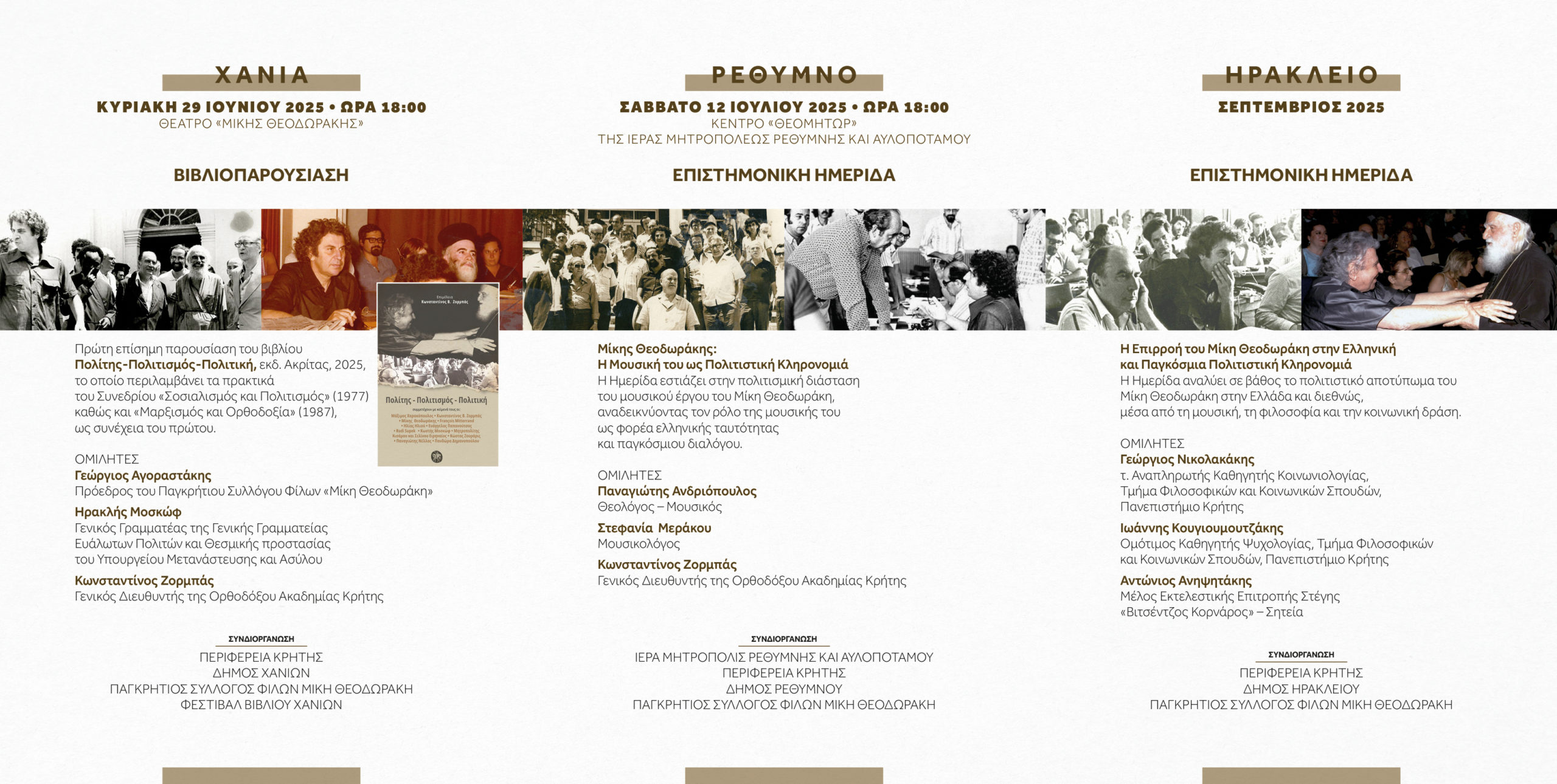 Η Ορθόδοξος Ακαδημία Κρήτης και ο Σύλλογος Φίλων «Μίκη Θεοδωράκη», σε συνδιοργάνωση με την Ιερά Μητρόπολη Ρεθύμνης και Αυλοποτάμου, την Περιφέρεια Κρήτης, τον Δήμο Χανίων, τον Δήμο Ρεθύμνης, τον Δήμο Ηρακλείου και το Φεστιβάλ Βιβλίου Χανίων, και με αφορμή την απόφαση του Υπουργείου Πολιτισμού να ανακηρύξει το έτος 2025 ως Έτος Μίκη Θεοδωράκη, διοργανώνει μία «Τριλογία Ιδεών» αφιερωμένη στη μνήμη και στο έργο του μεγάλου συνθέτη, φίλο του Ιδρύματος ενός από τους σημαντικότερους συνθέτες και πνευματικούς ανθρώπους της σύγχρονης Ελλάδας (Χανιά, Ρέθυμνο, Ηράκλειο).