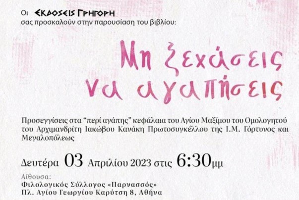 Οι εκδόσεις ΓΡΗΓΟΡΗ προσκαλούν, τη Δευτέρα 3 Απριλίου στις 18:30, στην παρουσίαση του βιβλίου «Μη ξεχάσεις να αγαπήσεις» του Αρχιμανδρίτη Ιακώβου Κανάκη. Το βιβλίο προλογίζει ο Σεβασμιώτατος Μητροπολίτης Κορίνθου κ. Διονύσιος. Η παρουσίαση θα λάβει χώρα στην αίθουσα Φιλολογικός Σύλλογος «Παρνασσός» στην Πλατεία Αγίου Γεωργίου Καρύτση 8, στην Αθήνα.