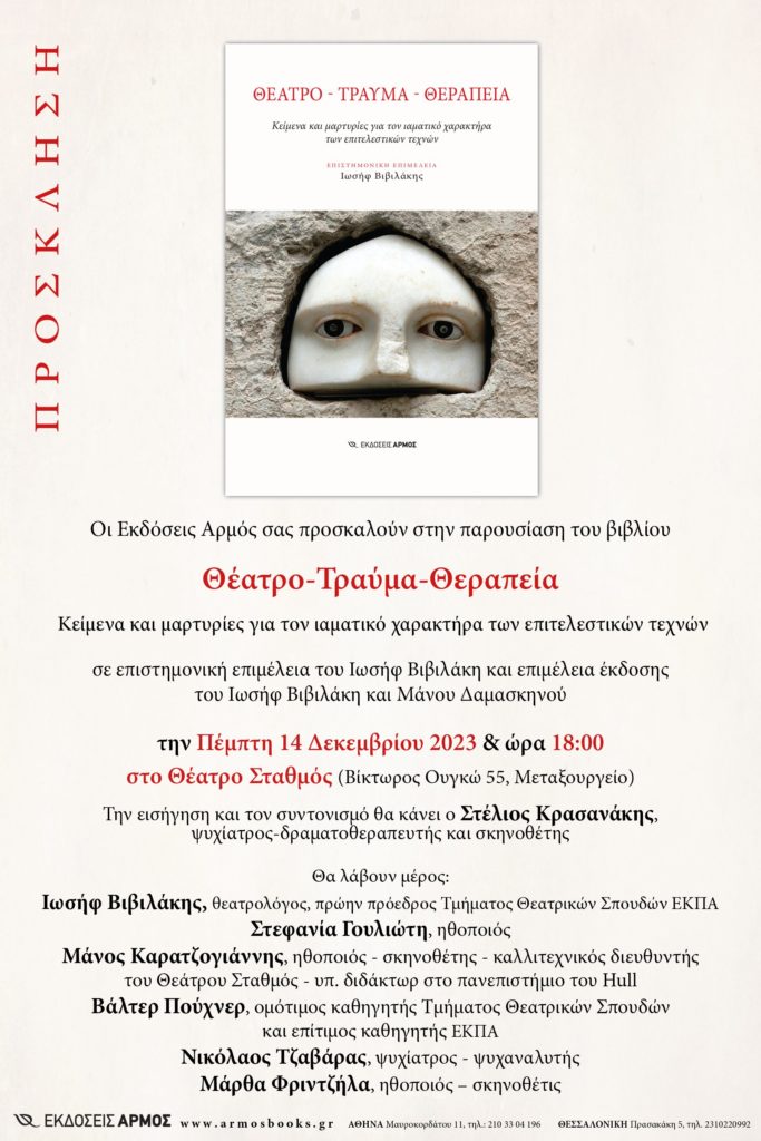 01/12/2023 01/12/2023 Tην Πέμπτη 14 Δεκεμβρίου στις 6.00 το απόγευμα στο Θέατρο Σταθμός, Βίκτωρος Ουγκώ 55 – Μεταξουργείο θα πραγματοποιηθεί η παρουσίαση του βιβλίου «Θέατρο – Τραύμα -Θεραπεία. Κείμενα και μαρτυρίες για τον ιαματικό χαρακτήρα των επιτελεστικών τεχνών» (εκδόσεις Αρμός). Την εισήγηση και τον συντονισμό θα κάνει ο Στέλιος Κρασανάκης, ψυχίατρος-δραματοθεραπευτής και σκηνοθέτης. Θα λάβουν μέρους: Ιωσήφ...