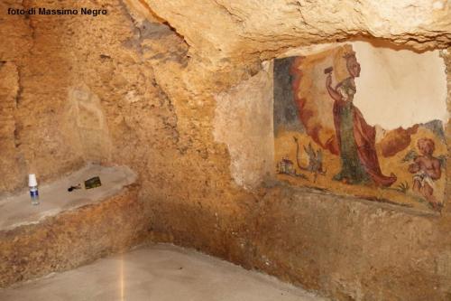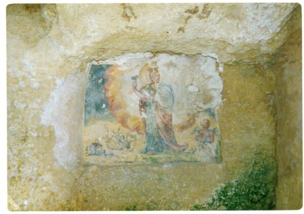 Πριν την αποκατάσταση ήταν εμφανής η επιγραφή “Terrae Migiani” (γη του Μιτζάνο, περιοχής όπου βρίσκεται το παρεκκλήσι και η κρύπτη).