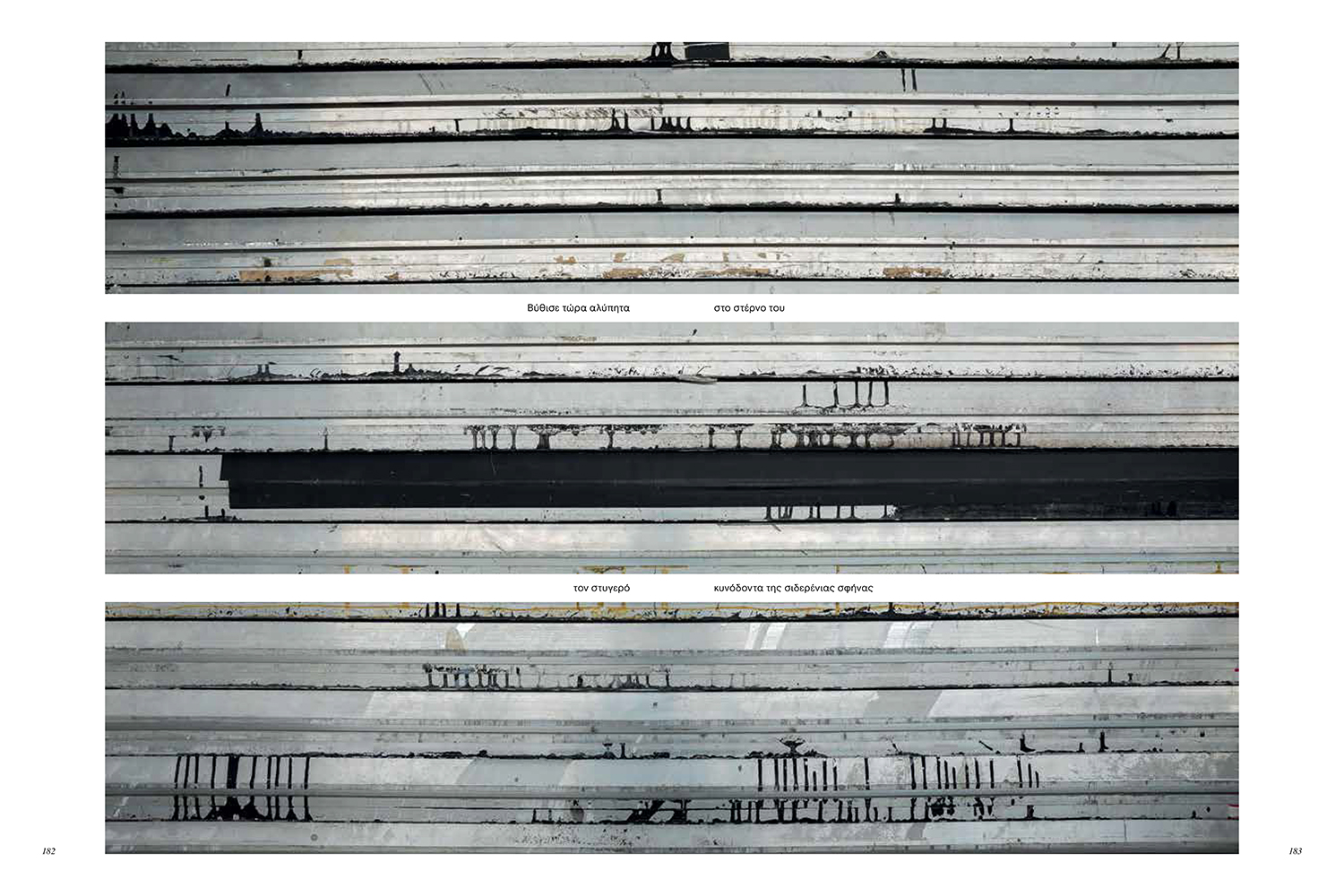 Ο Μιχάλης Κλουκίνας παρουσιάζει μια ιδιότυπη «συνομιλία»: εικόνες των άδειων θεάτρων μας στέκουν μαζί με θραύσματα από έργα που είχαμε εντάξει στον προγραμματισμό του Φεστιβάλ για το 2020, αλλά δεν παρουσιάστηκαν εξαιτίας της πανδημίας. Εδώ η εικόνα δεν αποτυπώνει απλώς μια στιγμή στον χρόνο, δημιουργεί έναν μη-τόπο, ο οποίος αποτελεί το σκηνικό ενός νέου έργου: Θεατρικό κείμενο και εικόνα χωρίς τη μεσολάβηση ερμηνευτή. Ο τόπος αποκτά «φωνή», αλλά η φωνή είναι κομματιασμένη, φτάνει μόνο τμηματικά σε εμάς – στα μάτια και όχι στα αυτιά μας. Τονίζει την απουσία, την ακινησία, το «μετέωρον». Μια αίσθηση «ανοίκειου» αναδύεται σε κάθε σελίδα, αλλά, ταυτόχρονα, γινόμαστε μάρτυρες μιας ιερής βεβαιότητας: τα θέατρά μας, αρχαία και σύγχρονα, μας κοιτάζουν από τις σελίδες του λευκώματος διαμηνύοντας, μέσα απ’ την εύγλωττη σιωπή τους, ότι θα είναι πάντα εκεί.
