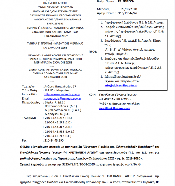 Με εγκύκλιο της υπουργού Παιδείας Νίκης Κεραμέως ανακαλείται το υπ. αριθμ Πρωτ. Φ16/11644/Δ2/28-1-2020 έγγραφο με θέμα “Ενημέρωση σχετικά με την ημερίδα “Σύγχρονη Παιδεία και Ελληνορθόδοξη Παράδοση” της Πανελλήνιας Ένωσης Γονέων “Η ΧΡΙΣΤΙΑΝΙΚΗ ΑΓΩΓΗ” για εκπαιδευτικούς Πρωτοβάθμιας και Δευτεροβάθμιας εκπαίδευσης και για μαθητές Λυκείων της Περιφέρειας Αττικής, που υπογράφει η Γενική Γραμματέας του υπουργείου κ. Αναστασία Γκίκα.
