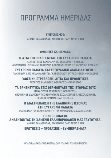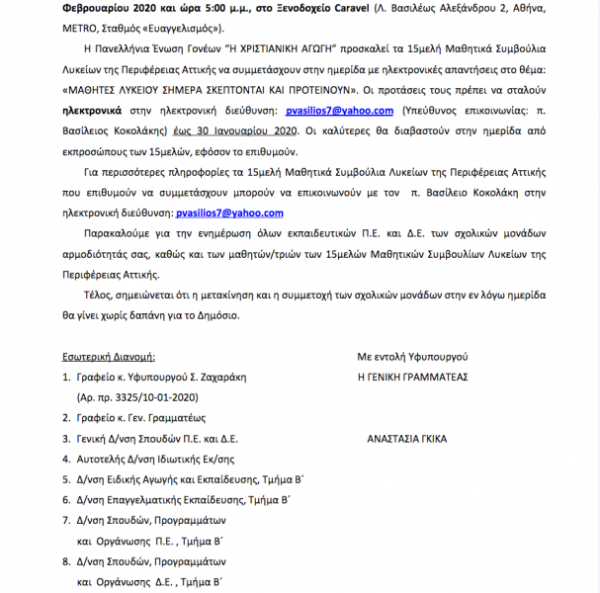 Η Πανελλήνια Ένωση Γονέων “Η ΧΡΙΣΤΙΑΝΙΚΗ ΑΓΩΓΗ” προσκαλεί τα 15μελή Μαθητικά Συμβούλια Λυκείων της Περιφέρειας Αττικής να συμμετάσχουν στην ημερίδα με ηλεκτρονικές απαντήσεις στο θέμα: «ΜΑΘΗΤΕΣ ΛΥΚΕΙΟΥ ΣΗΜΕΡΑ ΣΚΕΠΤΟΝΤΑΙ ΚΑΙ ΠΡΟΤΕΙΝΟΥΝ».