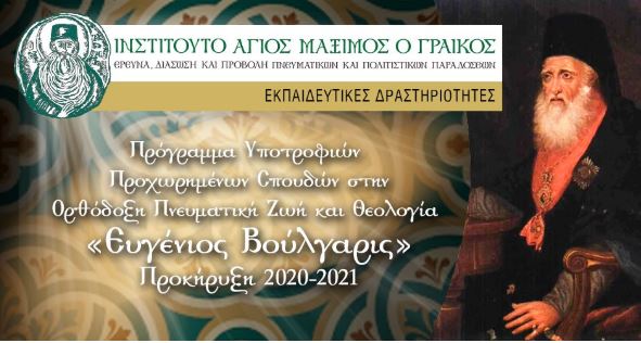 Ανακοινώθηκε σήμερα, 22 Ιουλίου 2020, το Πρόγραμμα Υποτροφιών Προχωρημένων Σπουδών στην Ορθόδοξη Πνευματική Ζωή και Θεολογία «Ευγένιος Βούλγαρις» 2020-2021 του Ινστιτούτου Άγιος Μάξιμος ο Γραικός.