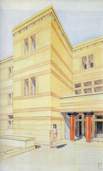 Σχεδιαστική αναπαράσταση της εισόδου του ανακτόρου των Αρχανών με τους βωμούς