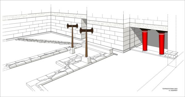 Σχεδιαστικό ανάπτυγμα της νότιας εισόδου του ανακτόρου με δύο βάσεις για διπλούς πελέκεις