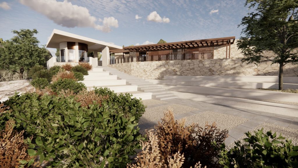 Φωτορεαλιστική απεικόνιση της αφετηρίας διαδρομής περιήγησης και κατάβασης προς τον αρχαιολογικό χώρο της Φαιστού