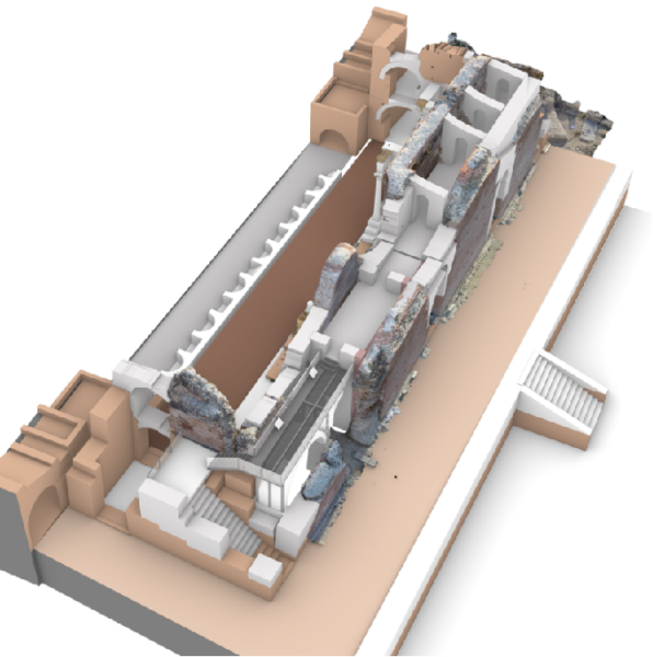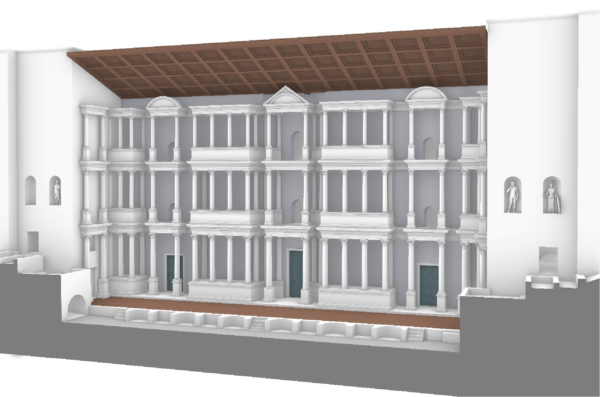Το σκηνικό οικοδόμημα του Θεάτρου αποτελείται από το κυρίως κτήριο της σκηνής, στην όψη του οποίου διαμορφώνεται μνημειώδης τοίχος με κιονοστοιχίες (scaenae frons) επί τεσσάρων βάθρων, το προσκήνιο με τον μπροστινό του τοίχο (fonts pulpiti) και τα παρασκήνια εκατέρωθεν του προσκηνίου. Εξωτερικά του σκηνικού οικοδομήματος διαμορφώνονταν στοά σχήματος Π, η οποία οδηγούσε στις δύο εισόδους των παρόδων. Εσωτερικά, στη στάθμη του ισογείου, το σκηνικό οικοδόμημα χωρίζεται σε επτά συμμετρικά διατεταγμένους θολωτούς χώρους, τρεις από τους οποίους αποτελούν διόδους -κεντρική είσοδος και δύο εκατέρωθεν αυτής, ανατολικά και δυτικά. Όλοι οι χώροι στο ισόγειο έχουν ημικυλινδρικούς θόλους που εδράζονται στους εγκάρσιους τοίχους. Η διαρρύθμιση του ορόφου είναι παρόμοια με αυτή του ισογείου. Το μνημείο εμφανίζει αποσάθρωση και εκτενή κατάρρευση τοίχων, θόλων, τόξων, επισφαλή ισορροπία και μεγάλες παραμορφώσεις. Για αποκατάσταση της μορφής του σκηνικού οικοδομήματος και των παρασκηνίων και για την στατική εξασφάλιση του μνημείου, κατόπιν καθαίρεσης της μεταλλικής κατασκευής αντιστήριξης που αλλοιώνει τη μορφή του, προβλέπεται να ανακτηθούν τα τόξα των ανοιγμάτων και να συνδεθούν μεταξύ τους οι δύο επιμήκεις τοίχοι μέσω ανάκτησης τμημάτων των εγκάρσιων τοίχων και της θολοδομίας του ισογείου, αποκατάσταση ρηγματώσεων, ανάκτηση εγκάρσιων τοιχοποιιών και αποκατάσταση προσκηνίου.