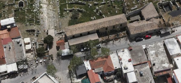 Αεροφωτογράφιση. Τα κτήρια των αποθηκών από την οδό Απόλλωνος (βόρεια του αρχαιολογικού χώρου)