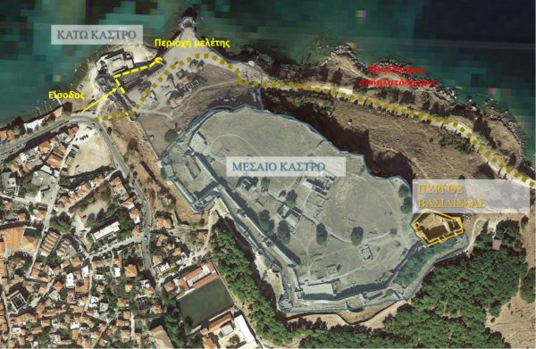 Η διάρθρωση του Κάστρου σε τρεις γραμμές οχύρωσης και η περιοχή μελέτης στο Κάτω Κάστρο