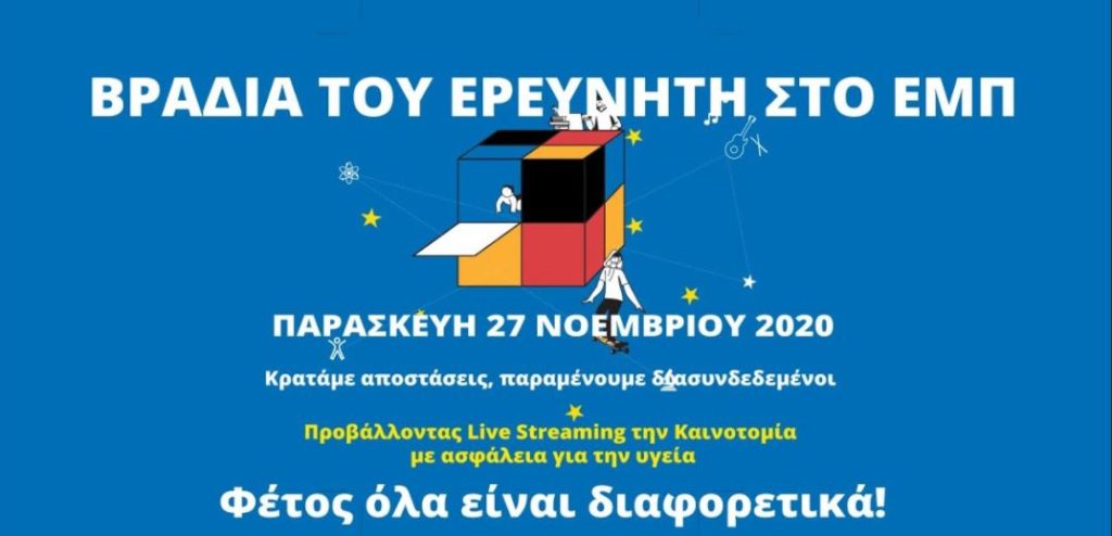 Το Εθνικό Μετσόβιο Πολυτεχνείο, συνεπές στο ραντεβού του για έβδομη συνεχή χρονιά, διοργανώνει στο εμβληματικό κτήριο Αβέρωφ τη Βραδιά του Ερευνητή σήμερα, Παρασκευή 27 Νοεμβρίου 2020, μέσω live streaming. Η Εναρκτήρια τηλε-Εκδήλωση (8:15-9:15 το πρωί) καθώς και όλο το μαγνητοσκοπημένο υλικό των 200 video των συμμετοχών των Ερευνητικών Ομάδων του Εθνικού Μετσόβιου Πολυτεχνείου, των Πανεπιστημίων της Αθήνας, Ερευνητικών Κέντρων, σχολείων, των συνεργαζόμενων φορέων και χορηγών, θα μεταδίδεται από το κανάλι της Βραδιάς του Ερευνητή στο ΕΜΠ από τις 8:15 το πρωί μέχρι 20:15 το βράδυ.