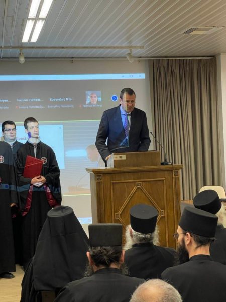 Μετά τον χαιρετισμό ο Πρωτεπιστάτης του Αγίου Όρους προσέφερε στη Θεολογική Σχολή ως ευλογία ένα αντίγραφο της Ιεράς Εικόνας του “Άξιον Εστί” καθώς και βιβλία που αφορούν την Αθωνική Πολιτεία.