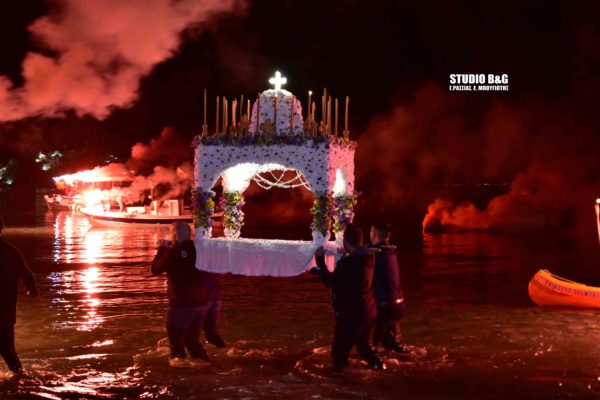 Η περιφορά του Επιταφίου στο Τολό του Δήμου Ναυπλιέων στην Αργολίδα το βράδυ της Μεγάλης Παρασκευής, γίνεται μέσα σε ιδιαίτερα κατανυκτική ατμόσφαιρα με τον Επιτάφιο να μπαίνει μέσα στη θάλασσα.