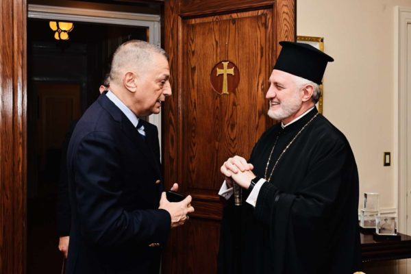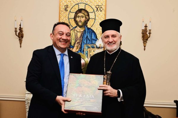 Ο Σεβασμιώτατος Αρχιεπίσκοπος Αμερικής κ. Ελπιδοφόρος εικονίζεται με τον Κωνσταντίνο Βλάση, Υφυπουργό Παιδείας, Θρησκευμάτων και Αθλητισμού της Ελλάδας. (Φωτογραφία: Orthodox Observer/Δημήτριος Πανάγος)
