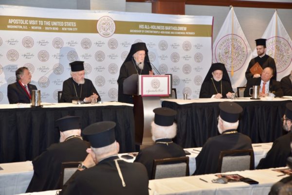 “Σήμερα στην επέτειο των 30 ετών από την εκλογή του Παναγιωτάτου που αποτελεί τον μακροβιότερο Πατριάρχη Κωνσταντινουπόλεως και Νέας Ρώμης στην ιστορία λαμβάνουμε τη μεγάλη Χάρη και Ευλογία της πατρικής και Πατριαρχικής του αγάπης σε αυτά τα λαμπρά Θυρανοίξια του Ναού μας. Ο Παναγιώτατος, ως ο παγκόσμιος φρουρός της Ορθοδοξίας, μας κομίζει ως δώρο του ίδιου του Αγίου Νικολάου τα Ιερά του Λείψανα που βρίσκονται εδώ μπροστά μας, την αριστερή του Χείρα” ανέφερε ο Σεβασμιώτατος Αρχιεπίσκοπος Αμερικής, κατά την ομιλία του στο Σημείο ¨Μηδέν”.