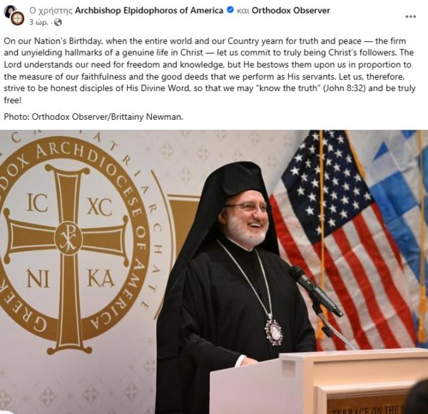 Με αφορμή την εθνική εορτή της 4ης Ιουλίου, Ημέρα Ανεξαρτησίας των Ηνωμένων Πολιτειών, ο Αρχιεπίσκοπος Αμερικής κ. Ελπιδοφόρος απευθύνει μήνυμα πνευματικής ενίσχυσης και καθοδήγησης προς τον κλήρο και τον λαό, τονίζοντας πως η αλήθεια και η ειρήνη είναι τα σταθερά και ακλόνητα χαρακτηριστικά μιας ειλικρινούς εν Χριστώ ζωής.