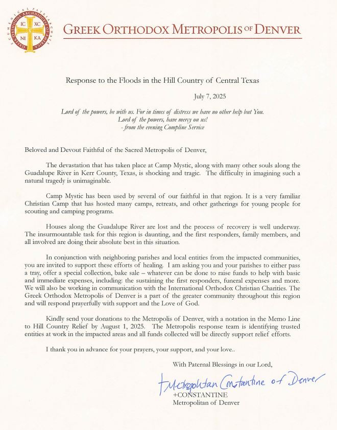 “Παρακαλούμε στείλτε τις δωρεές σας στη Μητρόπολη Ντένβερ, με μια σημείωση στη γραμμή Υπόμνημα (Memo Line) “Hill Country Relief” έως την 1η Αυγούστου 2025. Η ομάδα ανταπόκρισης της Μητρόπολης εντοπίζει αξιόπιστους φορείς που εργάζονται στις πληγείσες περιοχές και όλα τα συγκεντρωθέντα χρήματα θα υποστηρίξουν άμεσα τις προσπάθειες ανακούφισης“, καταλήγει η επιστολή του Μητροπολίτη Ντένβερ.