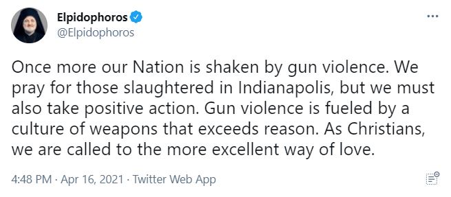 Μήνυμα αποδοκιμασίας της ένοπλης βίας στέλνει ο Σεβ. Αρχιεπίσκοπος Αμερικής κ. Ελπιδοφόρος με χθεσινή ανάρτηση του (16/4) σε μέσο κοινωνικής δικτύωσης, με αφορμή την επίθεση που εξαπέλυσε ένοπλος σκοτώνοντας τουλάχιστον οκτώ ανθρώπους στα γραφεία της εταιρείας ταχυμεταφορών FedEx στην Ινδιανάπολη των Ηνωμένων Πολιτειών, αργά το βράδυ της Πέμπτης 15 Απριλίου, 2021.