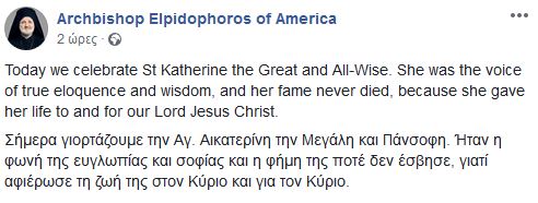 “Σήμερα γιορτάζουμε την Αγ. Αικατερίνη την Μεγάλη και Πάνσοφη. Ήταν η φωνή της ευγλωττίας και σοφίας και η φήμη της ποτέ δεν έσβησε, γιατί αφιέρωσε τη ζωή της στον Κύριο και για τον Κύριο” αναφέρει σε μήνυμά του στο λογαριασμό του σε μέσο κοινωνικής δικτύωσης ο Σεβασμιώτατος Αρχιεπίσκοπος Αμερικής κ. Ελπιδοφόρος με αφορμή τη σημερινή εορτή της Αγίας Αικατερίνης.