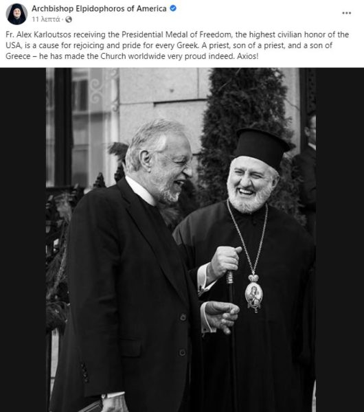 Ο Αρχιεπίσκοπος Αμερικής κ. Ελπιδοφόρος, με αφορμή την απονομή, έγραψε χαρακτηριστικά στο Facebook: “Αποτελεί αιτία αγαλλίασης και υπερηφάνειας για κάθε Έλληνα. Ιερέας, γιος ιερέα και γιος της Ελλάδας – έχει κάνει την Εκκλησία παγκοσμίως πολύ περήφανη. Αξιος!”.