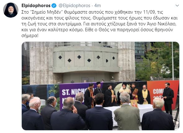 “Στο “Σημείο Μηδέν” θυμόμαστε αυτούς που χάθηκαν την 11/09, τις οικογένειες και τους φίλους τους. Θυμόμαστε τους ήρωες που έδωσαν και τη ζωή τους στα συντρίμμια. Γι’ αυτούς χτίζουμε ξανά τον Άγιο Νικόλαο, και για έναν καλύτερο κόσμο. Είθε ο Θεός να παρηγορεί όσους θρηνούν σήμερα!” αναφέρει ο Σεβασμιώτατος Αρχιεπίσκοπος Αμερικής κ. Ελπιδοφόρος σε επίκαιρη ανάρτηση του, με φωτογραφικό στιγμιότυπο από τη σημερινή παρουσία του ενώπιον του ελληνορθοδόξου Ιερού Ναού του Αγίου Νικολάου στο Μανχάταν της Νέας Υόρκης.