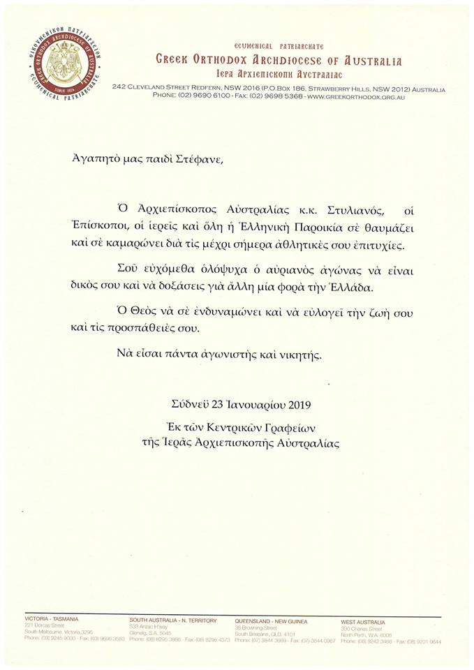 Συγχαρητήρια επιστολή προς τον Στέφανο Τσιτσιπά απέστειλε η Ιερά Αρχιεπισκοπή Αυστραλίας στην οποία μεταξύ άλλων αναφέρει: “ο αυριανός αγώνας να είναι δικός σου και να δοξάσεις για άλλη μια φορά την Ελλάδα”.