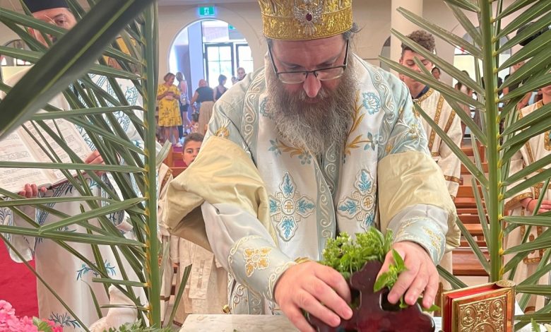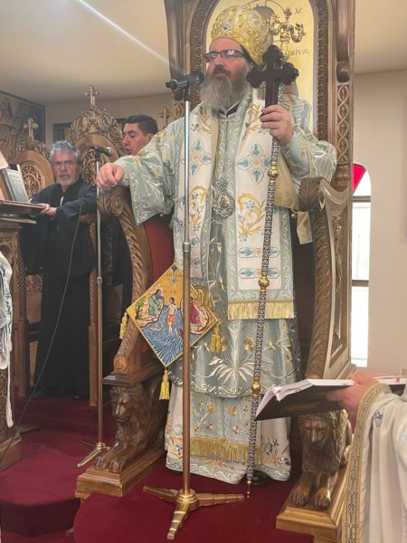 Ο Θεοφιλέστατος Επίσκοπος Κυανέων κ. Ελπίδιος, Αρχιεπισκοπικός Επίτροπος Πέρθης, χοροστάτησε στην Ακολουθία του Όρθρου και προεξήρχε της Θείας Λειτουργίας, ενώ στη συνέχεια τέλεσε τον Μεγάλο Αγιασμό.