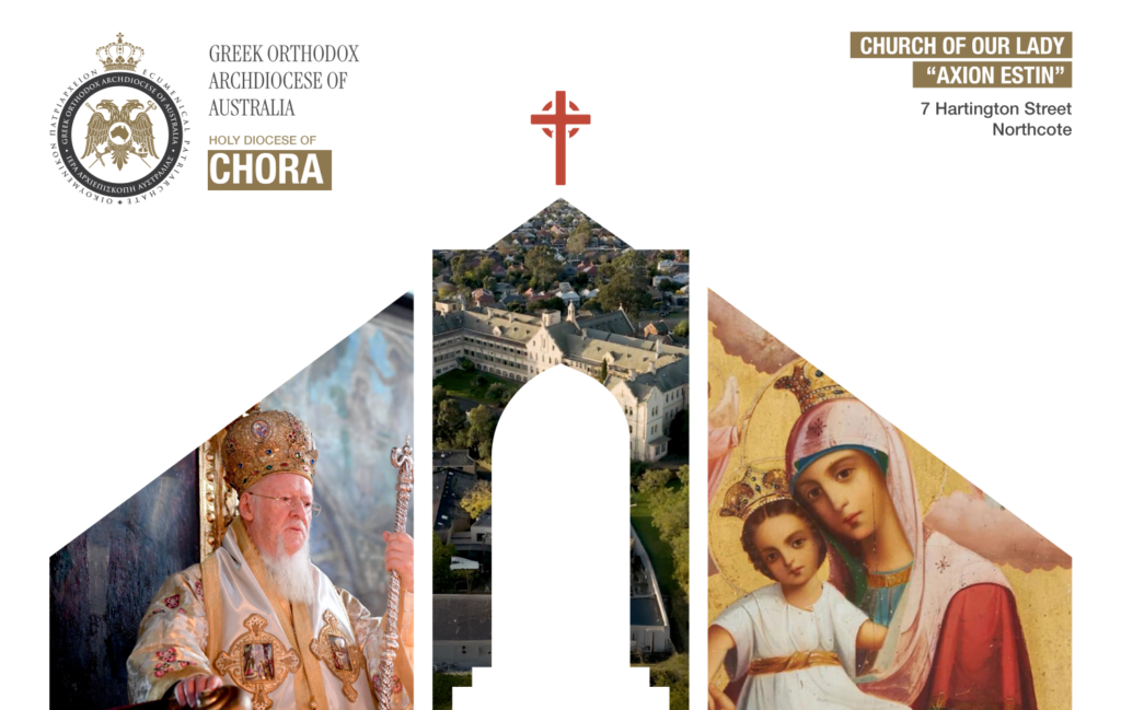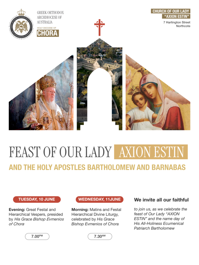 Η Ιερά Επισκοπή Χώρας προσκαλεί όλους τους πιστούς να συμμετάσχουν στις λατρευτικές εκδηλώσεις προς τιμήν της Παναγίας της «Άξιον Εστίν», στον φερώνυμο Ιερό Αρχιεπισκοπικό Ναό της Παναγίας (7 Hartington Street, Northcote), οι οποίες θα τελεστούν βάσει του ακόλουθου προγράμματος: