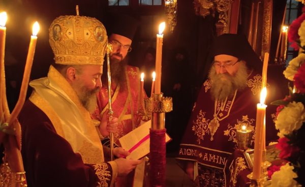 Ο Σεβασμιώτατος, που τις προηγούμενες ημέρες ευρίσκετο στο Άγιον Όρος, έγινε δεκτός σύμφωνα με το αγιορειτικό τυπικό στην είσοδο της Μονής, κατά την παραμονή της εορτής.
