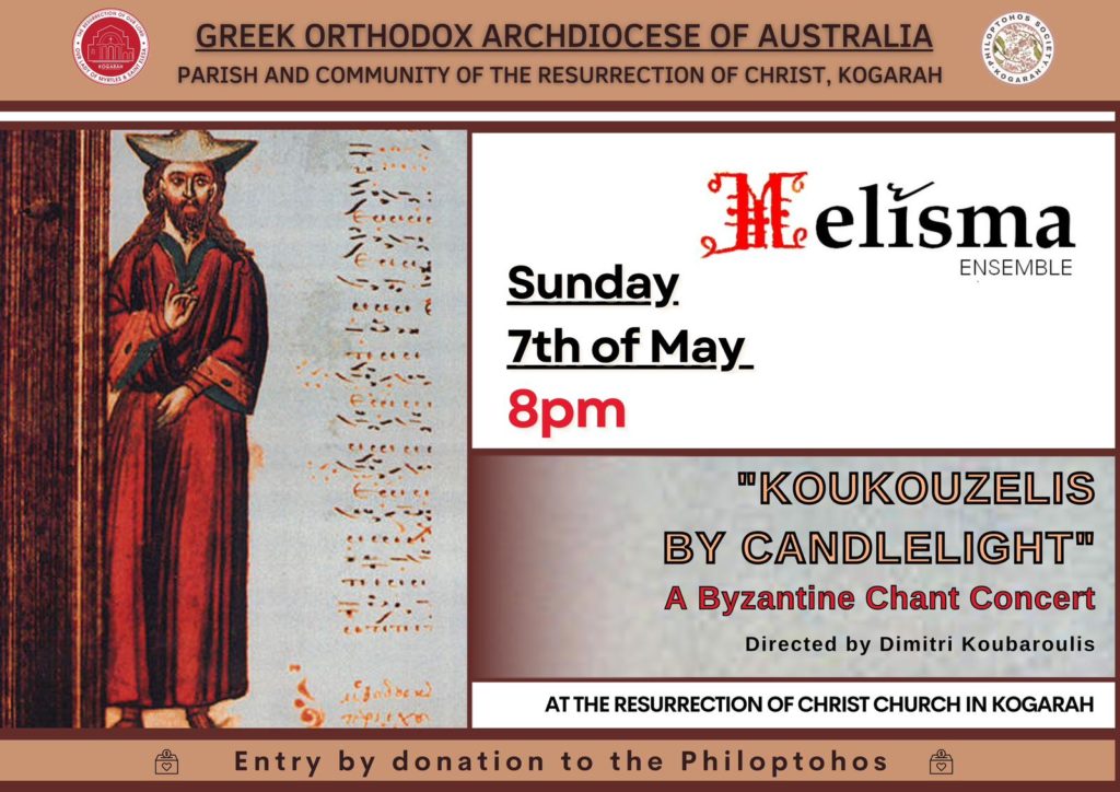 Την Κυριακή, 7 Μαΐου 2023 και ώρα 8μ.μ., ο ανδρικός Βυζαντινός χορός του Melisma Ensemble υπό τη διεύθυνση του κ. Δημητρίου Κουμπαρούλη θα παρουσιάσει την αριστουργηματική σύνθεση του Αγίου Ιωάννου Κουκουζέλη «Εξομολογήσομαί Σοι Κύριε» στην Ενορία-Κοινότητα Αναστάσεως του Χριστού, στο Kogarah του Σύδνεϋ.