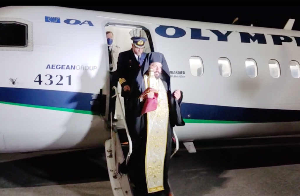 Στα Χανιά, η άφιξη θα γίνει στις 20:30, με πτήση της Aegean Airlines, συνοδευόμενο από τον Αρχιμανδρίτη Νικηφόρο Εικοσιδέκα, Πρωτοσύγκελλο της Ιεράς Μητροπόλεως Κυδωνίας και Αποκορώνου.