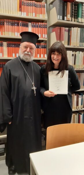 Η κ. Δέσποινα Μονιάκη γεννήθηκε στη πόλη Λουτβικσχάφεν της Γερμανίας και είχε συνδεθεί πνευματικά από τη σχολική της ηλικία με τον τότε εφημέριο της Ενορίας Λουτβικσχάφεν, και καθηγητή της στο γυμνάσιο, Πρωτοπρεσβύτερο Απόστολο Μαλαμούση. Σπούδασε Γεωλογία, με ειδικότητα σε θέματα προστασίας του περιβάλλοντος και εργάστηκε σε προγράμματα της ειδικότητάς της στη Γερμανία, Ελλάδα, Κύπρο και Ιταλία. Παρά το γεγονός ότι μετεκόμισε για οικογενειακούς λόγους στη Μπολώνια της Ιταλίας, είχε το ζήλο να σπουδάσει και Ορθόδοξη Θεολογία στο Μόναχο. Με αυτοθυσία και μεράκι περαίωσε τις σπουδές της, ταξιδεύοντας τακτικά μεταξύ Μπολώνιας και Μονάχου και έλαβε σήμερα, παρουσία και της δωδεκάχρονης κόρης της Ειρήνης το πτυχίο. Στην προσλαλιά της αναφέρθηκε η κ. Μονιάκη με αισθήματα ευγνωμοσύνης τόσο στους καθηγητές της, όσο και στον πνευματικό της, τον π. Απόστολο Μαλαμούση. Ο π. Απόστολος την παρώτρυνε να αποτελέσει εκεί στη Μπολώνια, στο μεγάλο κέντρο του ρωμαιοκαθολικισμού, μια φωνή Ορθοδοξίας, ως γέφυρα μεταξύ των εκκλησιών και των λαών.