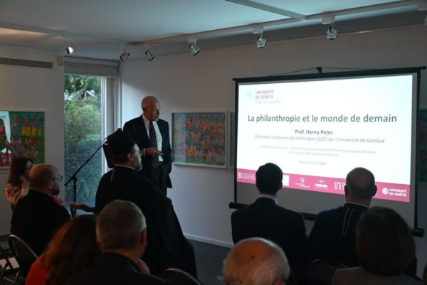 Στο βήμα ανήλθε ο κύριος ομιλητής της εκδηλώσεως, Καθηγητής της Νομικής Σχολής του Πανεπιστημίου της Γενεύης κ. Henry Peter, Διευθυντής του Κέντρου Φιλανθρωπίας, ο οποίος ανέπτυξε το θέμα με τίτλο «Η φιλανθρωπία και ο αυριανός κόσμος».