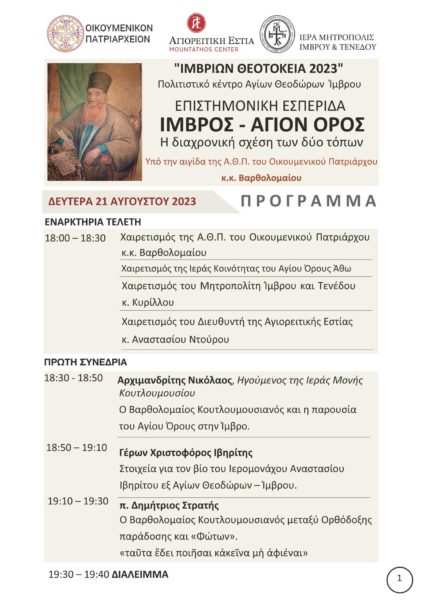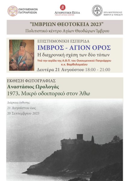 Η Αγιορειτική Εστία συμμετέχει για ακόμα μία χρονιά στις θερινές εκδηλώσεις «ΙΜΒΡΙΩΝ ΘΕΟΤΟΚΕΙΑ 2023» της Μητρόπολης Ίμβρου και Τενέδου, που πραγματοποιούνται το φετινό καλοκαίρι στην Ίμβρο με πληθώρα θρησκευτικών, μουσικών, επιστημονικών και πολιτιστικών εκδηλώσεων. Το σύνολο των εκδηλώσεων έχει τεθεί υπό την αιγίδα του Οικουμενικού Πατριάρχου κ.κ. Βαρθολομαίου.