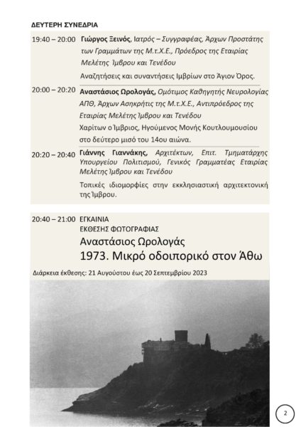 Μετά την ολοκλήρωση της Επιστημονικής εσπερίδας, θα ακολουθήσουν τα εγκαίνια της έκθεσης φωτογραφίας του Αναστάσιου Ωρολογά με τίτλο «1973. Μικρό οδοιπορικό στον Άθω». Στην έκθεση παρουσιάζεται για πρώτη φορά, υλικό του Ομότιμου Καθηγητή Νευρολογίας στο Α.Π.Θ. από την πρώτη του επίσκεψη στην Αθωνική Πολιτεία το 1973, το οποίο εστιάζει κυρίως στην ιδιαίτερη αρχιτεκτονική των μοναστηριών. Ο κ. Ωρολογάς, ο οποίος κατάγεται και ο ίδιος από την Ίμβρο, έλαβε τα πρώτα μαθήματα φωτογραφίας από τον θείο του, διάσημο φωτογράφο, Σπύρο Μελετζή.