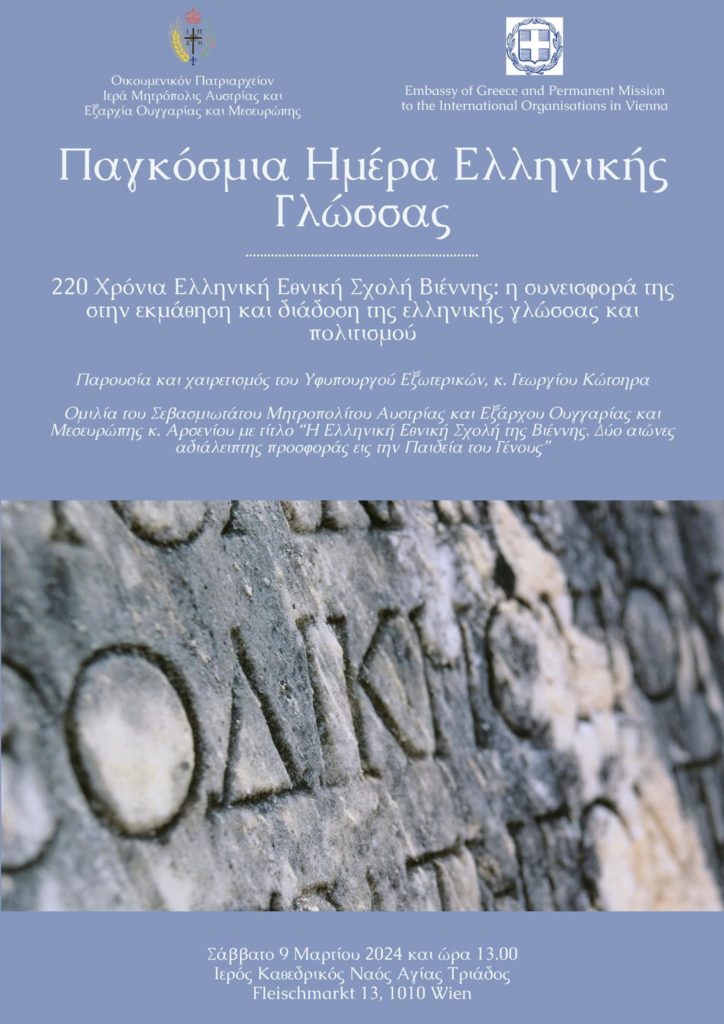 Ο Σεβασμιώτατος Μητροπολίτης Αυστρίας, Έξαρχος Ουγγαρίας και Μεσευρώπης κ. Αρσένιος, ως Διευθυντής της Ελληνικής Εθνικής Σχολής Βιέννης, απευθύνει πρόσκληση στην εκδήλωση στο πλαίσιο του εορτασμού της Παγκόσμιας Ημέρας Ελληνικής Γλώσσας με θέμα: «220 Χρόνια Ελληνική Εθνική Σχολή Βιέννης: Η συνεισφορά της στην εκμάθηση και διάδοση της ελληνικής γλώσσας και πολιτισμού» το Σάββατο, 9 Μαρτίου 2024, ώρα 1 μ.μ. στον Καθεδρικό Ιερό Ναό Αγίας Τριάδος Βιέννης.