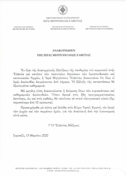 Ανακοίνωση με την οποία αναστέλλει τις Ιερές Ακολουθίες λόγω της ανησυχητικής εξελίξεως της επιδημίας του κορωναϊού στην Ελβετία, εξέδωσε η Ιερά Μητρόπολη.