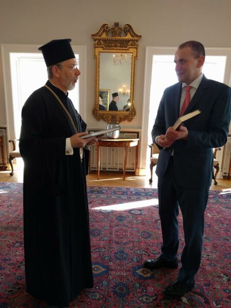 Ο επίσκοπος ευχαρίστησε τον Δρ. Benediktsson για την τιμητική πρόσκληση, διεβίβασε τις ευχές του Οικουμενικού Πατριάρχου, υπέγραψε στο βιβλίο επισκεπτών και δώρισε στον Πρόεδρο την μελέτη του Ιερολ. Αρχιδιακόνου κ. Iωάννου Χρυσαυγή, αφιερωμένη στα είκοσι πέντε έτη Πατριαρχίας του Παναγιωτάτου, και την έκδοση της Θείας Λειτουργίας στη Σουηδική γλώσσα.