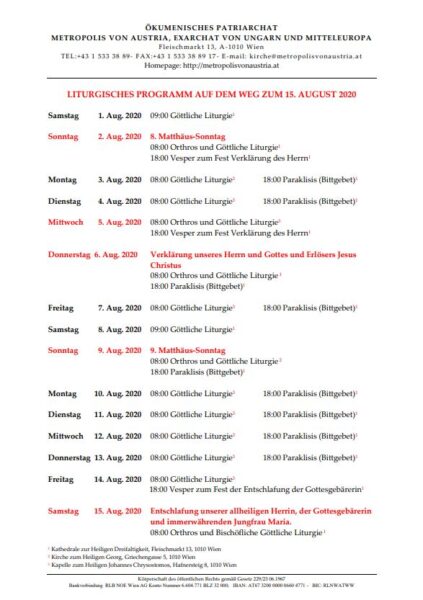 ΙΕΡΑ ΜΗΤΡΟΠΟΛΗ ΑΥΣΤΡΙΑΣ ΚΑΙ ΕΞΑΡΧΙΑ ΟΥΓΓΑΡΙΑΣ ΚΑΙ ΜΕΣΕΥΡΩΠΗΣ – Επισυνάπτεται το Λειτουργικό Πρόγραμμα για τις ημέρες του Δεκαπενταύγουστου: