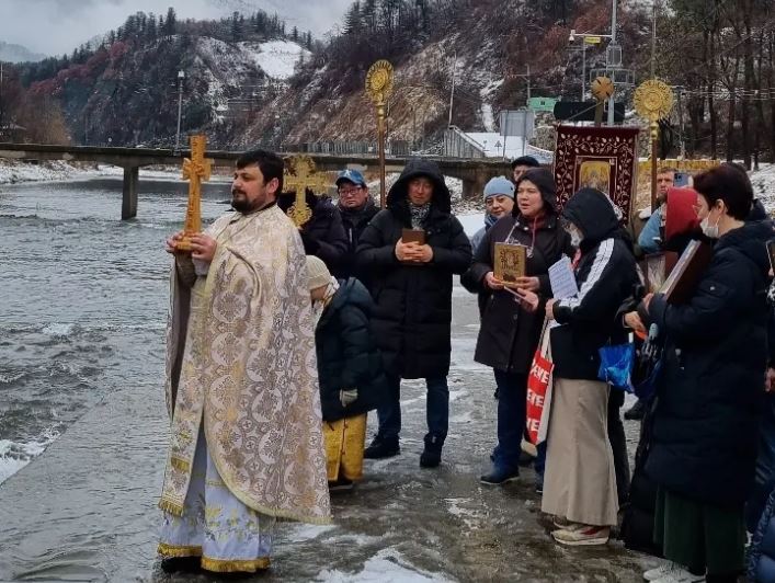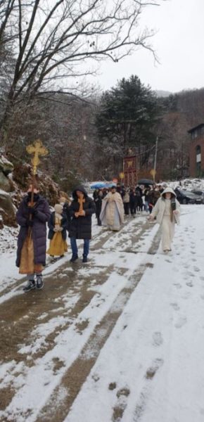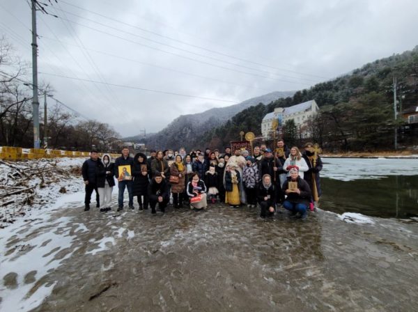 Λίγο αργότερα όλοι οι πιστοί κατευθύνθηκαν στον παρακείμενο χιονισμένο ποταμό και παρακολούθησαν την τέλεση του Μεγάλου Αγιασμού των υδάτων. Τέλος, πριν την αναχώρησή τους για την Σεούλ βοήθησαν στο καθάρισμα όλων των εσωτερικών και εξωτερικών χώρων της Ιεράς Μονής.